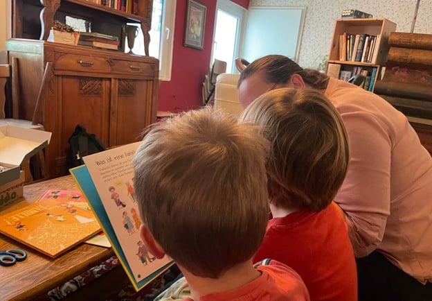 For our first session, we read “Wir sind Familie”, a picture book that celebrates the many different ways a family can look and be. Through its colorful pages and gentle storytelling, the book helped the children see that every family, whether large or small, with one parent or many, is bound by love and care. The story opened up conversations and plenty of curiosity among the little readers.